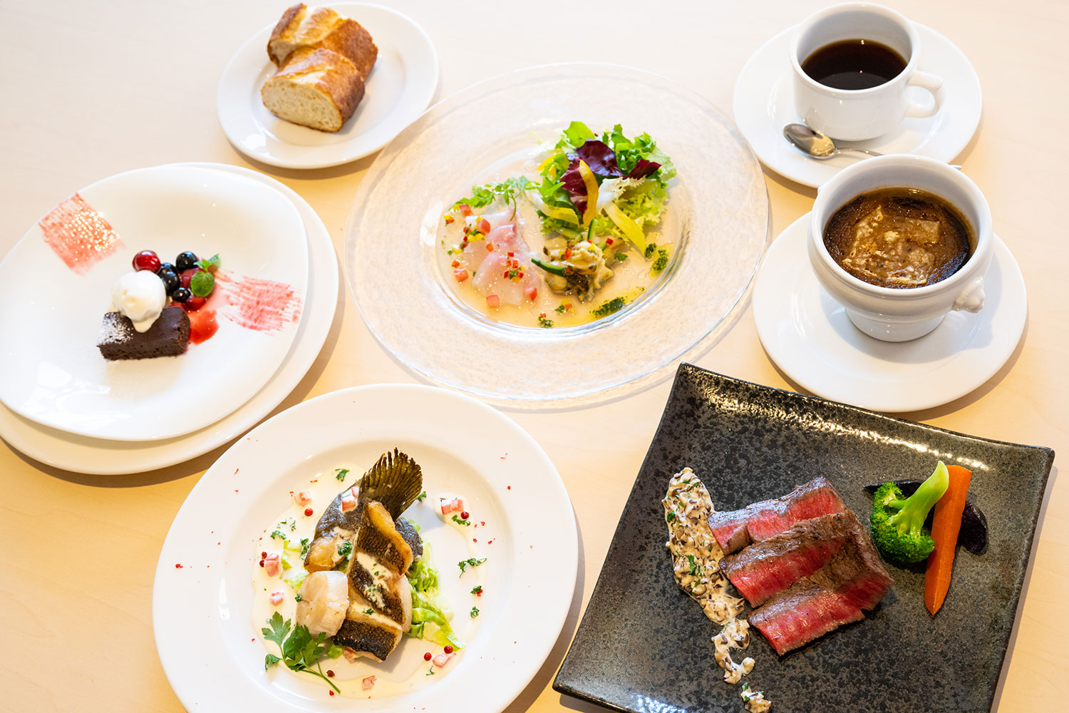 5,500円コース例…前菜・スープ・魚料理・肉料理・デザートのフルコース ※季節により旬の食材がかわります。